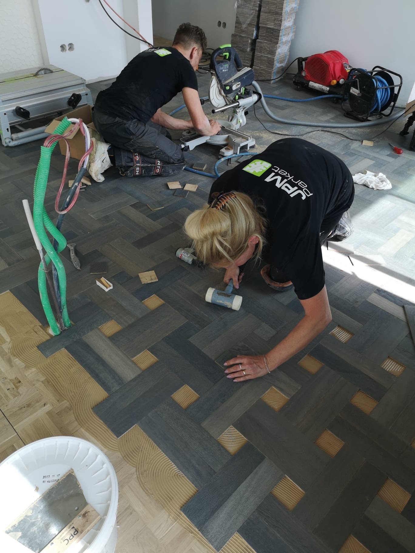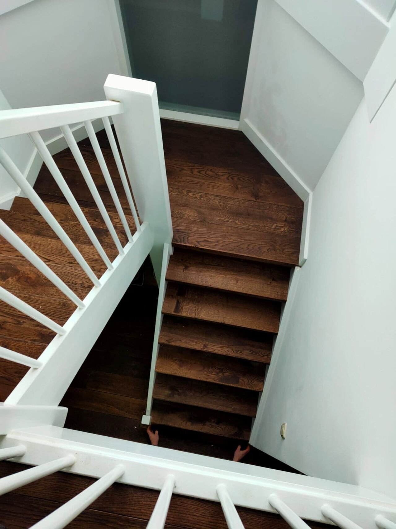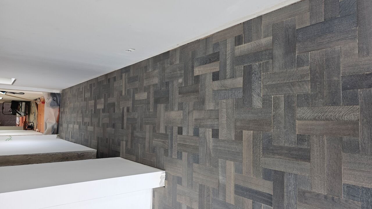 Een mooie combinatie van twee projecten. In eigen regio bekleedden we een trap en bordessen met overezettredes in eiken, strak afgewerkt met een kleurolie. Tegelijkertijd leverden we een bijzonder project op in Portugal: een vloer in eiken vlechtpatroon, afgewerkt met maar liefst zeven behandelingen voor een perfect eindresultaat.